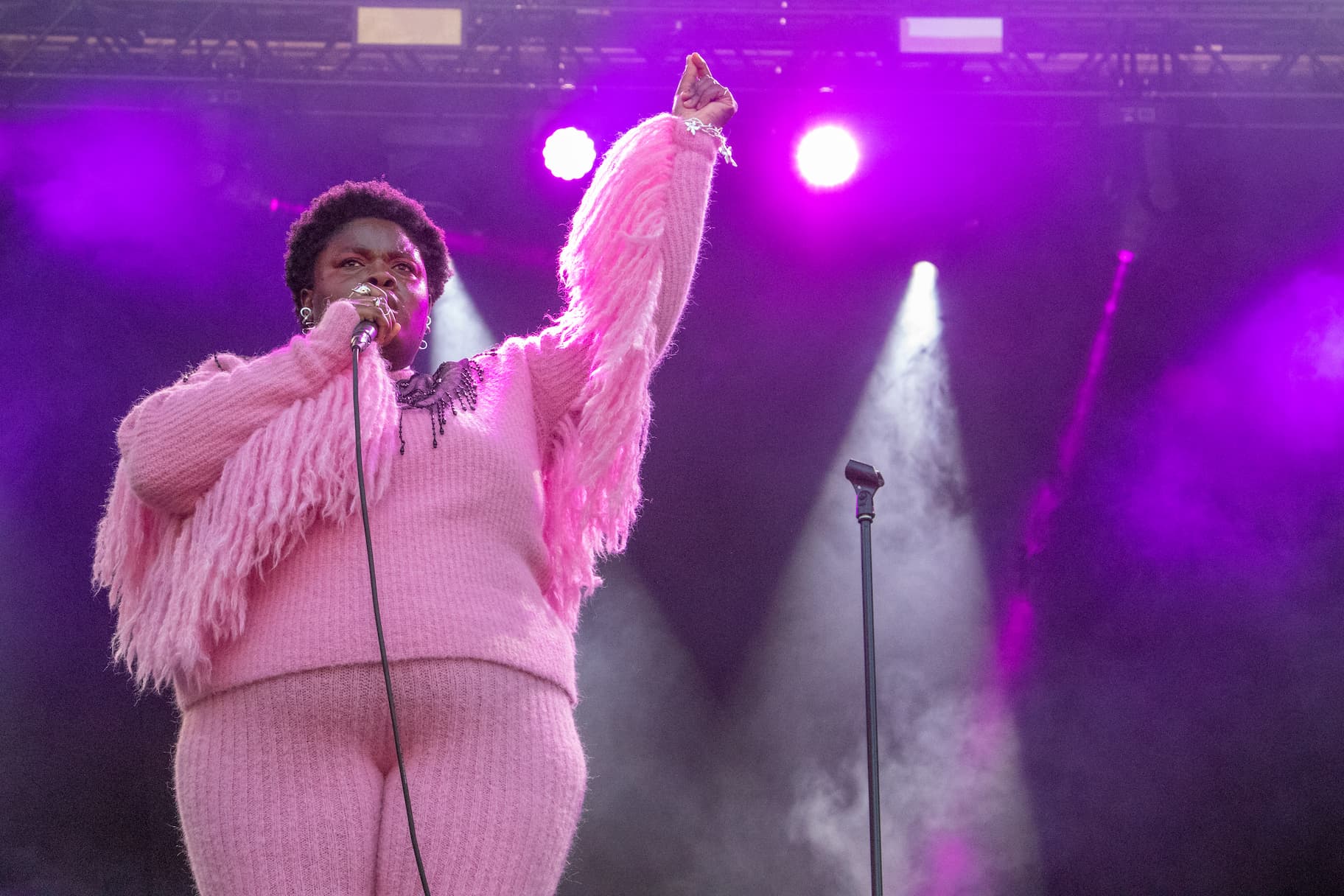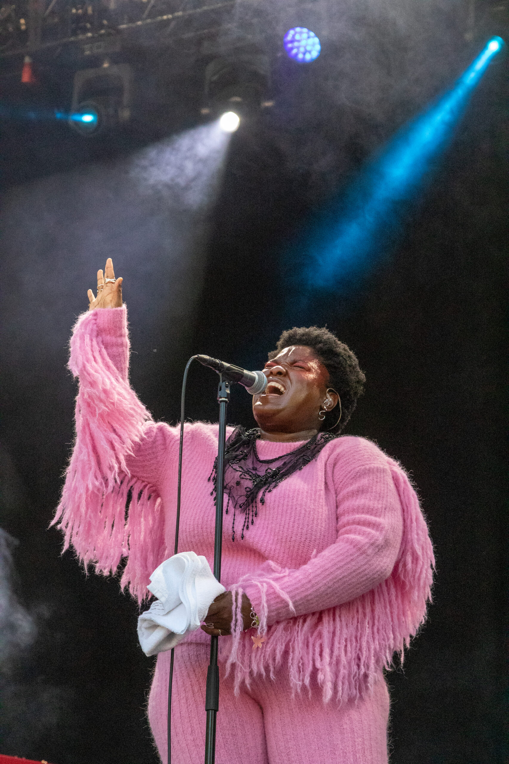 Kamara på Øya 2021, under pandemiversjonen av festivalen der Øya presenterte tre band/artister per dag for et sittende, kohortinndelt publikum ved Tøyenparken i Oslo. Line-up’en denne kvelden bestod foruten Kamara av Signe Marie Rustad og Jaga Jazzist. (Foto: Erik Valebrokk)