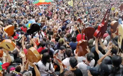 På eit av Facebook-klippa frå dei siste demonstrasjonane i Chile framførte ein armada av gitaristar saman med eit folkehav Victor Jara sin song «El Derecho de Vivir en Paz» (‘Retten til å leva i fred’) framfor Nasjonalbiblioteket i Santiago, og som munna ut i det alt nemnde slagordet «¡El pueblo unido, jamás será vencido!» – eit samla folk blir aldri overvunne.