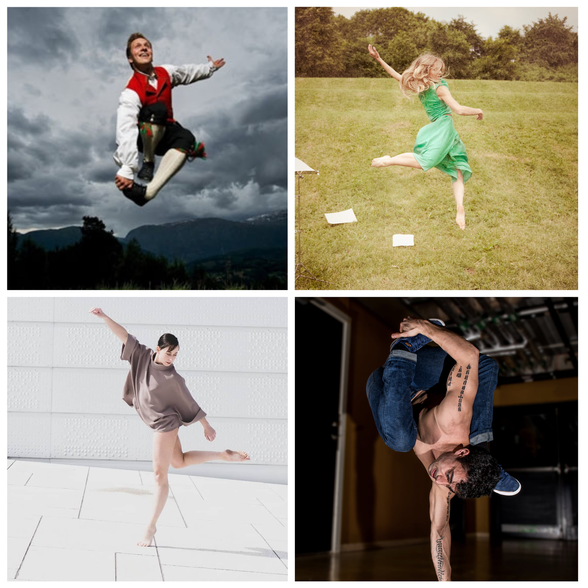 Folkedanser Torkjell Børsheim, prima ballerina Camilla Spidsøe Cohen, hiphoper og dansekunstner Navid Rezvani og multikunstner Silje Aker Johnsen er med i Hardanger Musikkfests Vårofferet av Igor Stravinsky. «Forvent ei danseoppleving utanom det vanlege», skriver festivalen på hjemmesidene sine. (Foto: Kollasj av Hardanger Musikkfest)