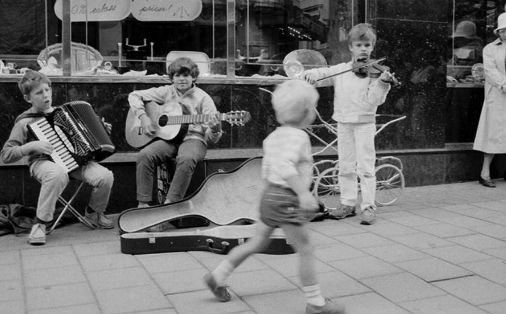 11-årige Odd Nordstoga og unge slektningar spelte på Karl Johan sommaren 1983. Kjelde: Pressefoto i samband med plata «Mykje lyd» (2017) (Foto: Morten Andersen)