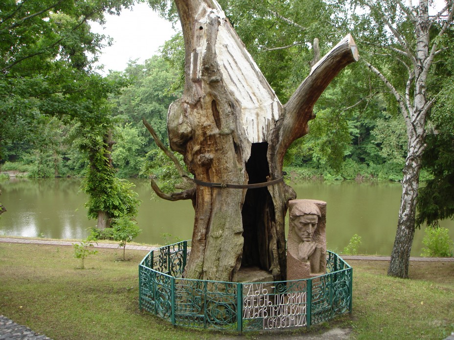Den 700 år gammel eika filosofen Skovoroda pleide å sitte under for å tenke ligger ved det lille vannet på museumsområdet som bærer navnet hans. Eika ble hardt skadet under 2. verdenskrig. Nå er den igjen, og ytterligere, skadet i rakettangrepet mot et av Ukrainas nasjonalmonumenter for bare noen dager siden. (Foto: Skovoroda-museet / www.skovorodamuseum.com.ua/)