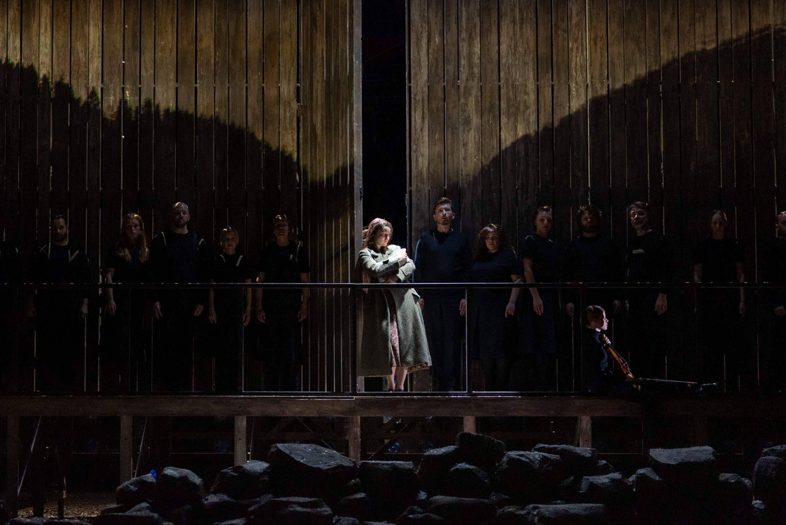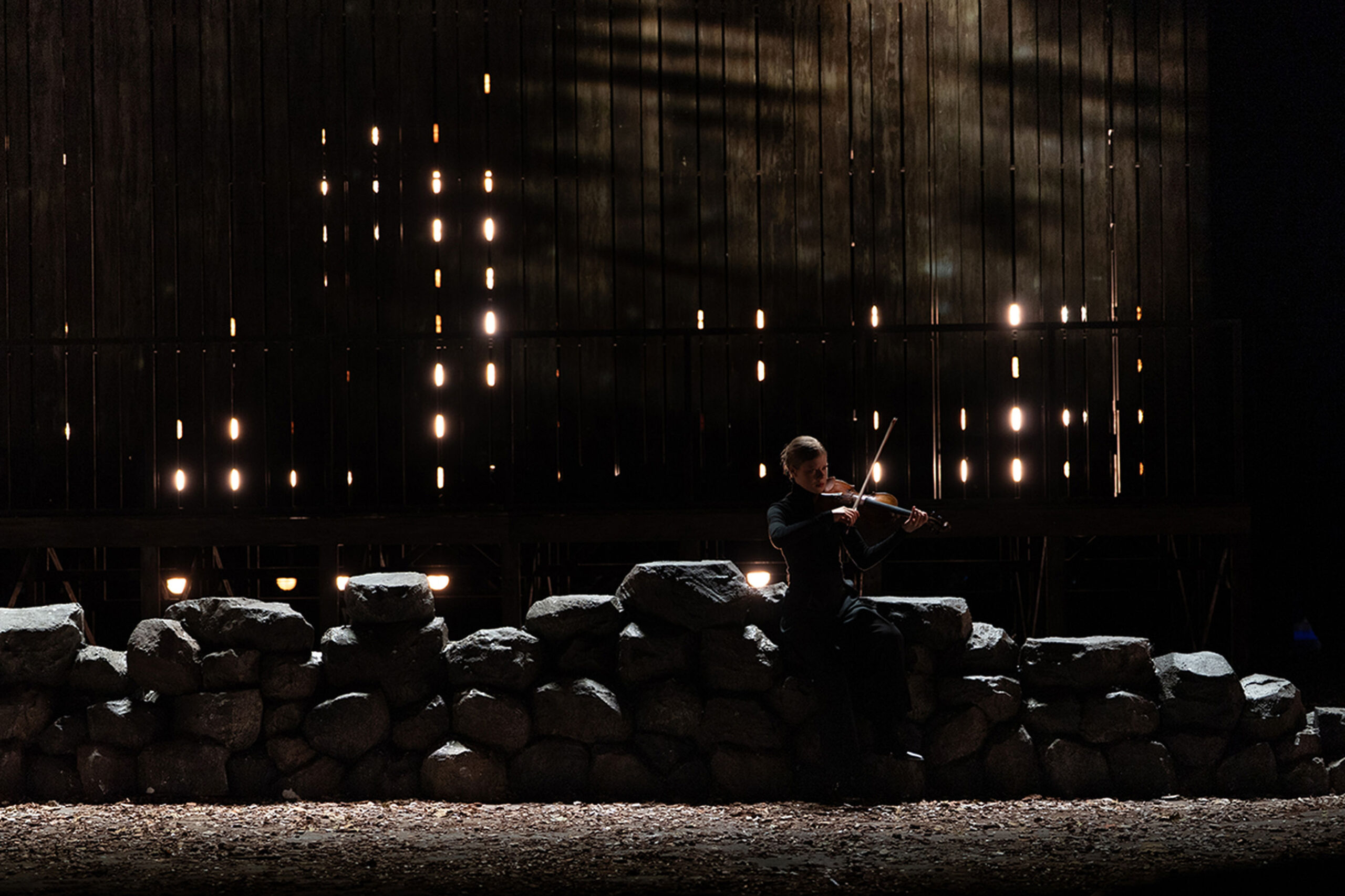 Spelemannsmotivet er fysisk til stede i Asle og Alida gjennom fiolinisten Alma Kraggerud, som aldri går av scenen, og som spiller sart og nydelig fiolin, skriver anmelderen. (Foto: Monika Kolstad / Bergen Nasjonale Opera)