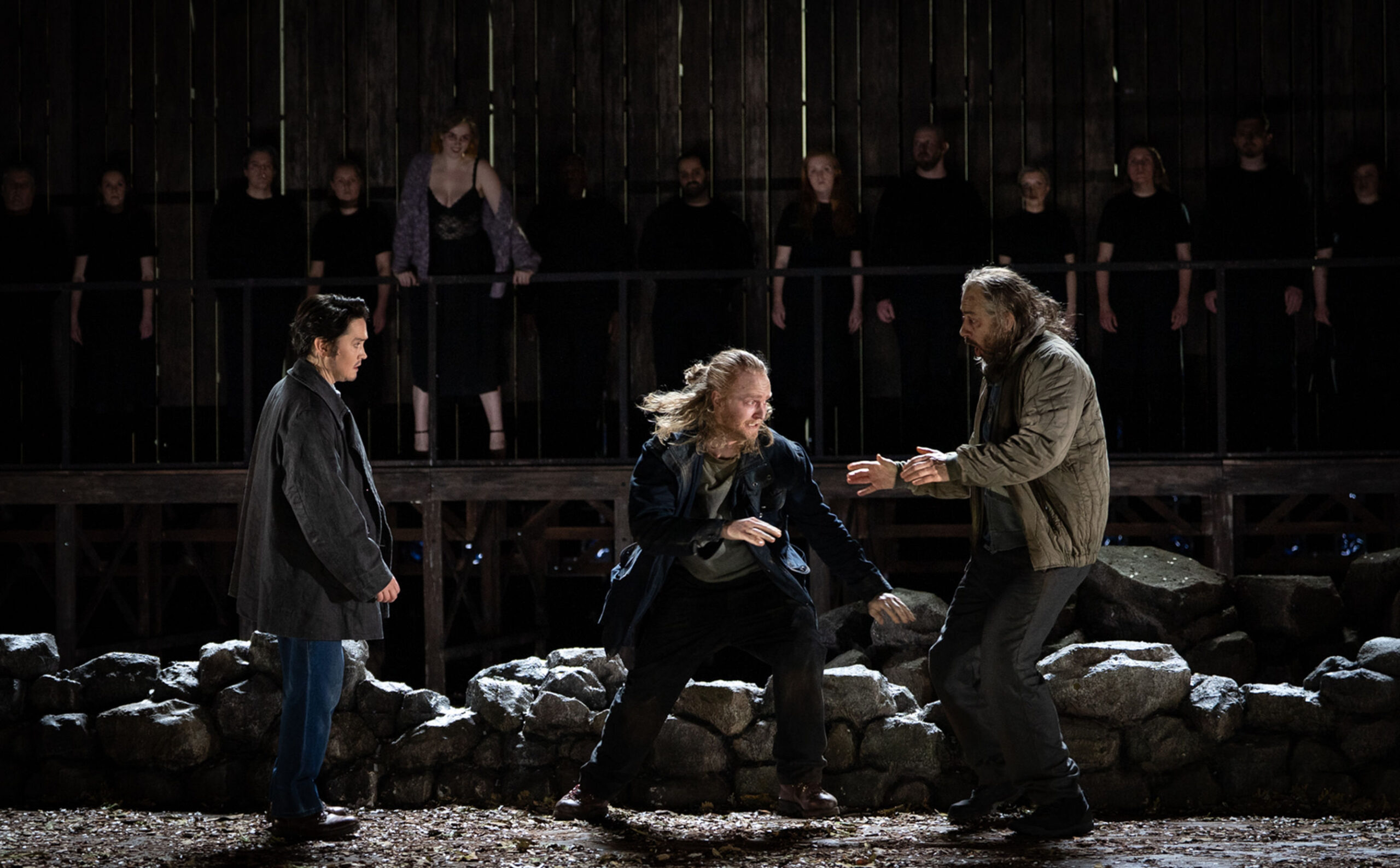 Scene fra Asle og Alida. Frank Kjosås som smykkeselgeren Åsleik (til venstre), Wiktor Sundqvist som Asle (i midten) og Johannes Weisser som Den eldre mannen. (Foto: Monika Kolstad / Bergen Nasjonale Opera)