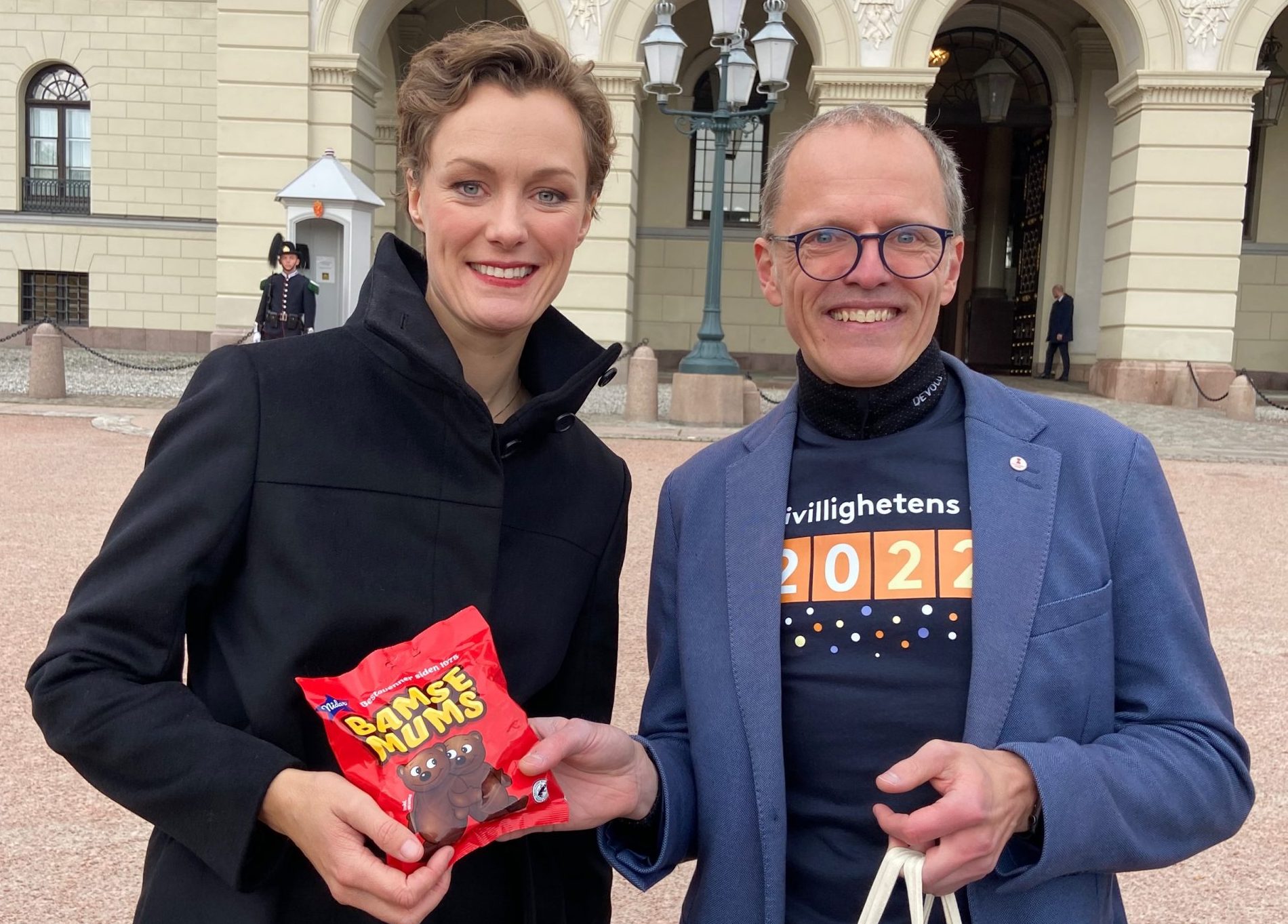 Anette Trettebergstuen kom de frivillige i møte utafor Slottet for å snakke om moms – her med Stian Slotterøy Johnsen og hans Bamsemums på vegne av Frivillighet Norge. (Foto: Frivillighet Norge)