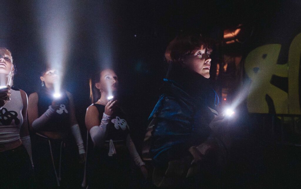 Det kommer så en monolog der Kristine snakker om makta alle på John Dee har til å endre verden, og denne går over til en lengre samtale om kroppsautonomi, vestlig sivilisasjon og matriarki. Monologen er lang, kanskje for lang og ender i det noe uortodokse grepet om å fremføre låta «Mista D» toppløs. Dette løses forsåvidt godt scenografisk med avslåtte lys og danserne som lyktebærende statister. Effekten er kul og frisk, og er et grep som virker å være svært i tråd med konseptet Kristine Blir Rapper presenterer. De tre-formede bokstavene på scenen kan bøyes med hengsler, og former sommerfuglvinger når Kristine står foran de. Kul effekt.