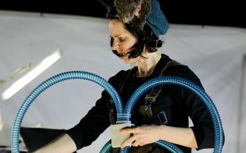 Forsøkskaninen Pip er både fascinert og skremt av de blå ledningene som er kobles til kroppen hennes (Foto: Johanne Karlsrud/Festspillene i Bergen)