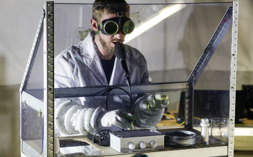 Professor Purre tester ut smaker på forsøkskaninen gjennom diverse instrumenter (Foto: Johanne Karlsrud/Festspillene i Bergen)
