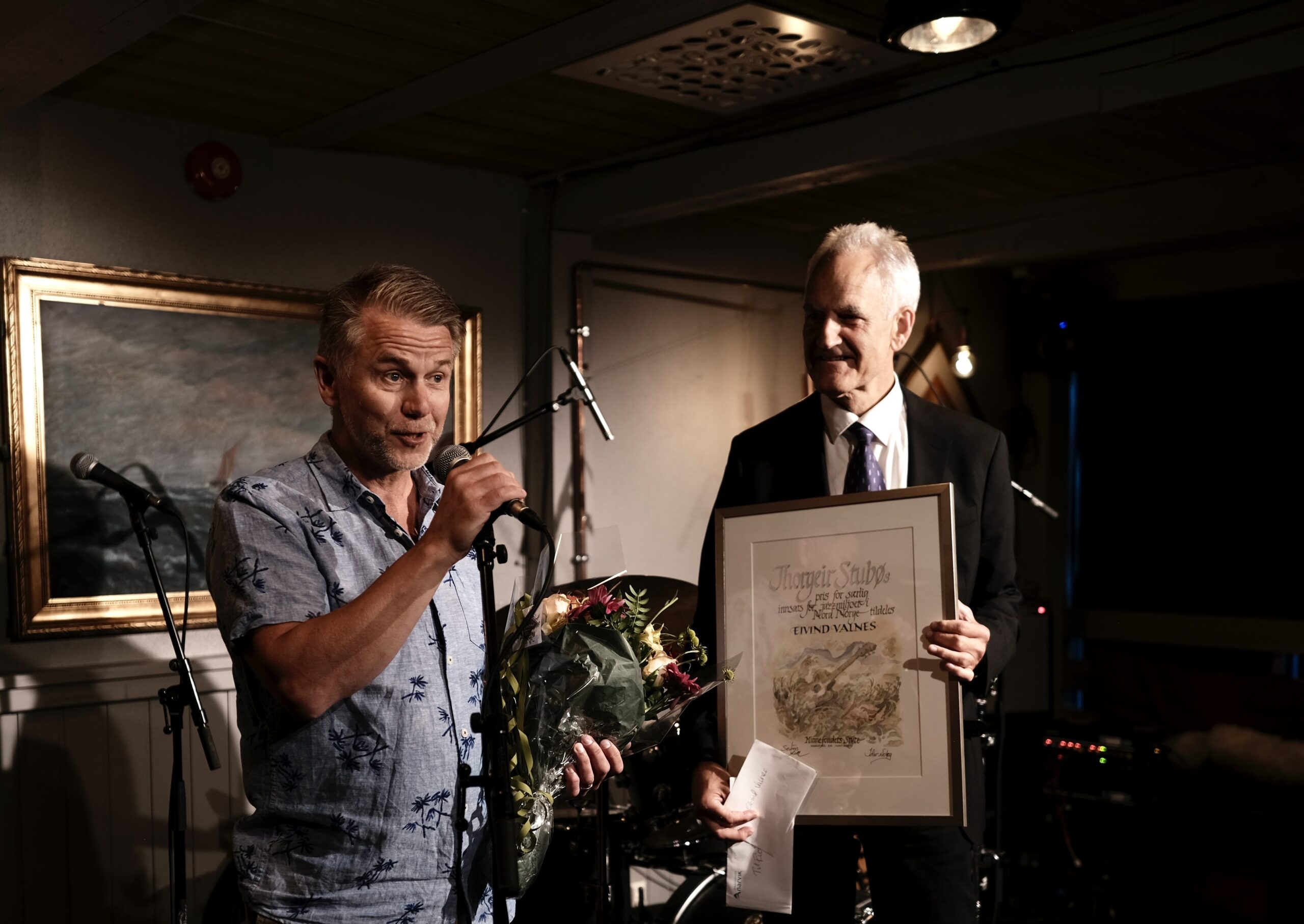 Stubøprisen deles ut hvert annet år til en person som gjør eller har gjort en særlig innsats for jazzmiljøet i Nord-Norge. Torsdag kveld ble prisen overrakt pianist og pedagog Eivind Valnes fra Sørreisa. Prisutdeler var Sofus Urke (til høyre) fra Thorgeir Stubøs minnefond. (Foto: Øivind Arvola)